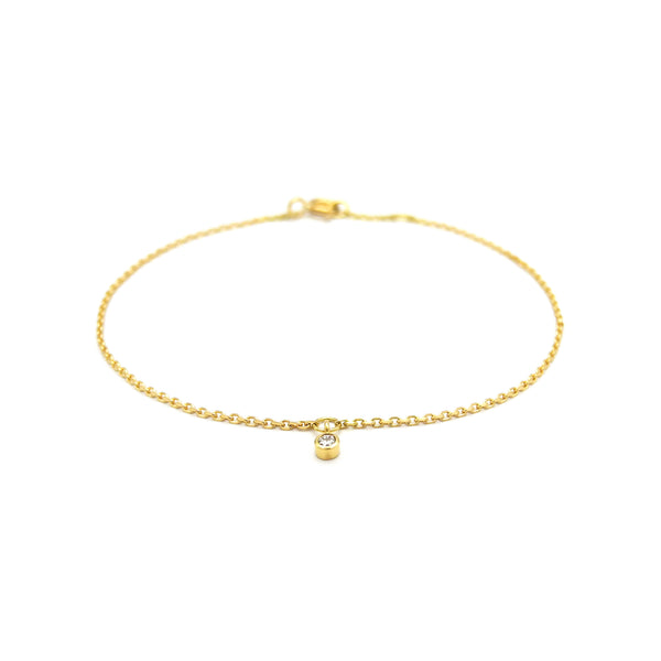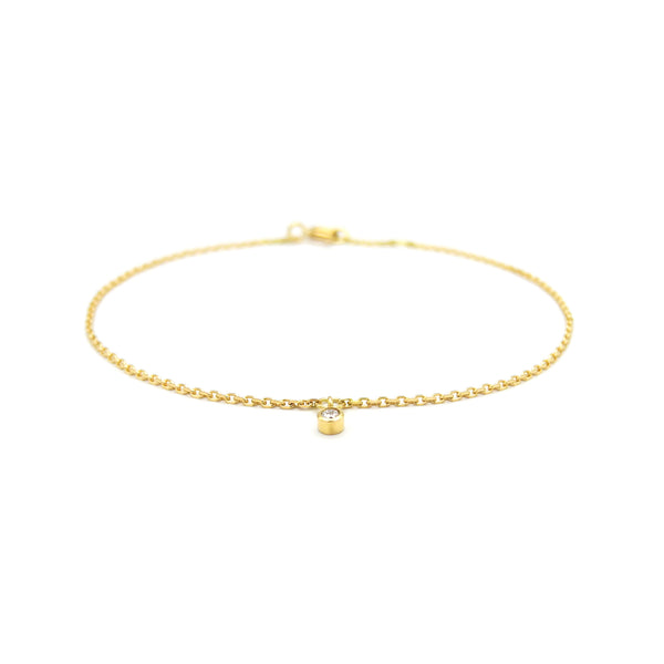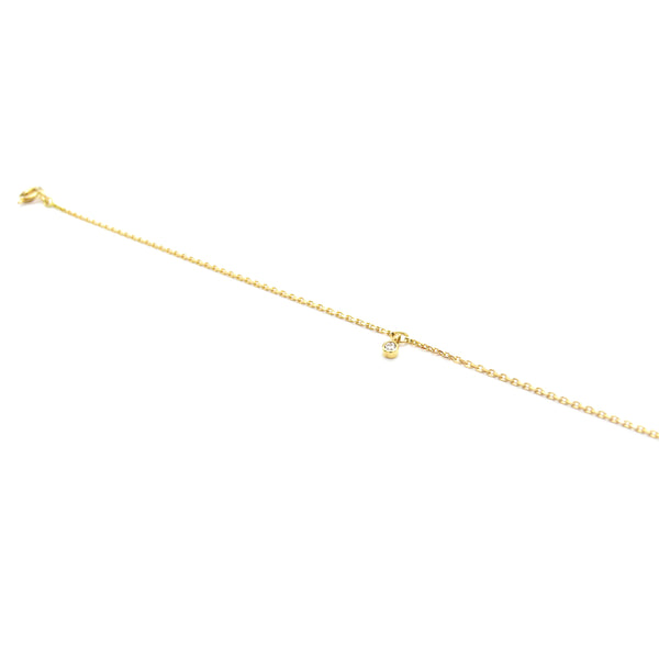 Zartes und wunderschönes Goldarmband aus 750-Gelbgold mit einem kleinen Brillanten, den wir zentriert und beweglich an einem kleinen Goldringlein montiert haben. Das Armkettchen ist in zwei Längen tragbar.
