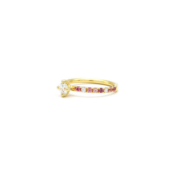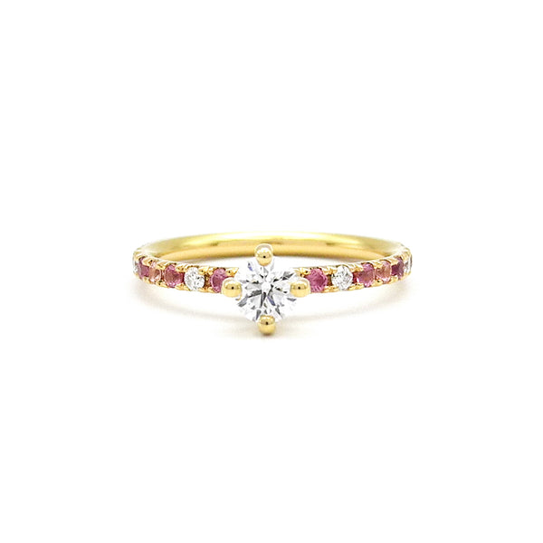 Diesen Verlobungsring haben wir aus 750-Gelbgold angefertigt. Zentral ist ein weißer Brillant in einer offenen Fassung gefasst, wodurch der edle Stein von allen Seiten Licht erhält und besonders strahlt. Ihn umgeben vier weitere Brillanten sowie 12 Saphire in zartem Rosa- und Pink.
