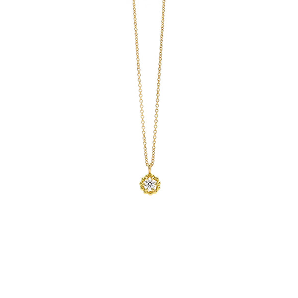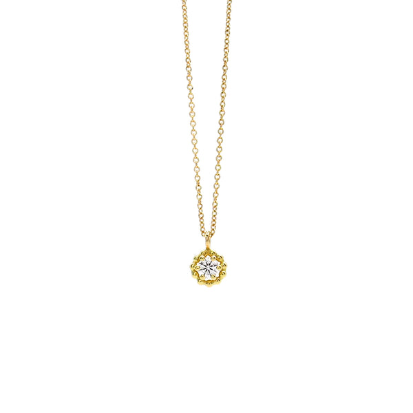 Für diese Goldkette haben wir einen feinweißen Brillanten in 750-Gold gefasst, die Fassung ist umrandet von kleinen Goldperlchen. Ein bezaubernder und feiner Brillanthalsschmuck, in zwei Längen einstellbar.