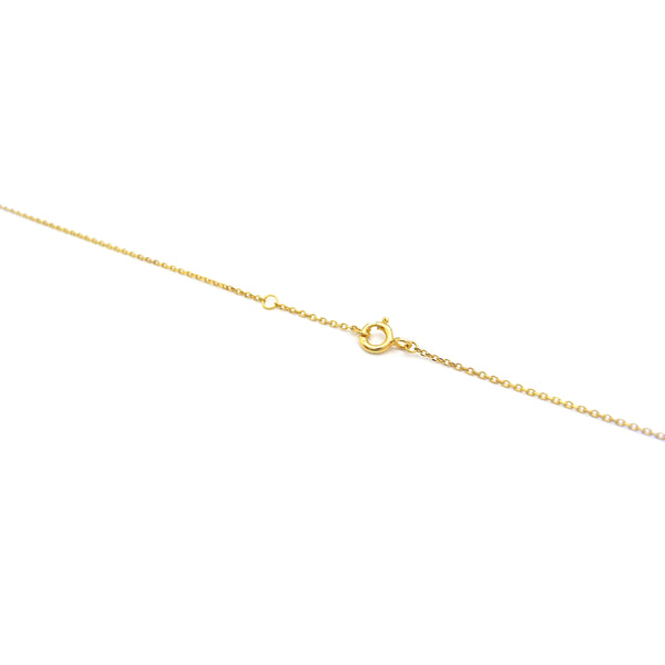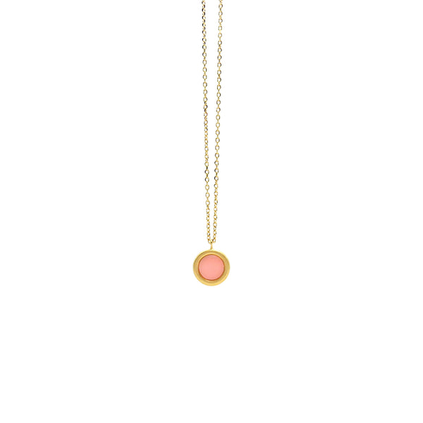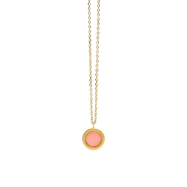 Hellrosa-mellierter Pinkopal, eingefasst in einen Rahmen im Rundprofil. Den Anhänger haben wir an eine leicht reflektierende Kette montiert. Die goldene Kette ist in zwei Längen einstellbar.