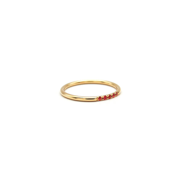 Zeitlos-minimalistischer Goldring aus 750-Roségold mit fünf kleinen Saphiren in sanftem Rot. Den Ring fertigen wir passgenau in Ihrer Ringgröße an, bitte nehmen Sie mit uns Kontakt auf, falls Ihre Ringgröße nicht gelistet ist.