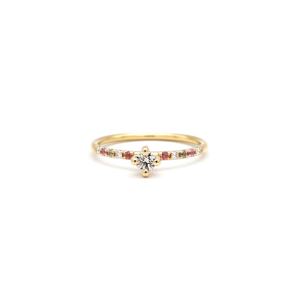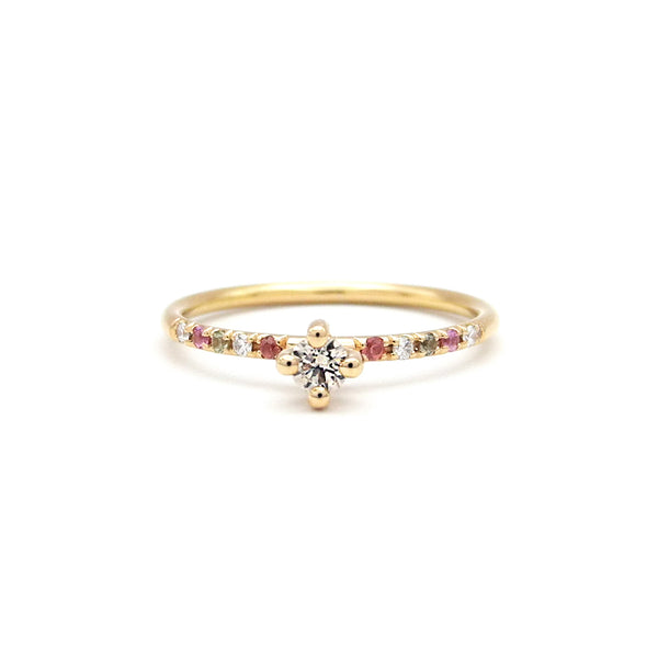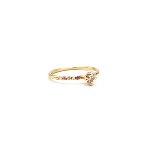 Dezent-verspielter Verlobungsring mit Brillant und Saphir, angefertigt aus 750-Roségold. Der zentral gesetzte zimtbraune Brillant wird von vier Krappen gehalten, durch die seitlich offene Fassung bekommt der edle Stein von allen Seiten Licht. Rechts und links der Fassung haben wir vier weiße Brillanten sowie Saphire in Pink, Pastellrosa und Pastellgrün  gefasst. Den Goldring fertigen wir passgenau in Ihrer Ringgröße an, bitte nehmen Sie mit uns Kontakt auf, falls Ihre Ringgröße nicht gelistet ist.