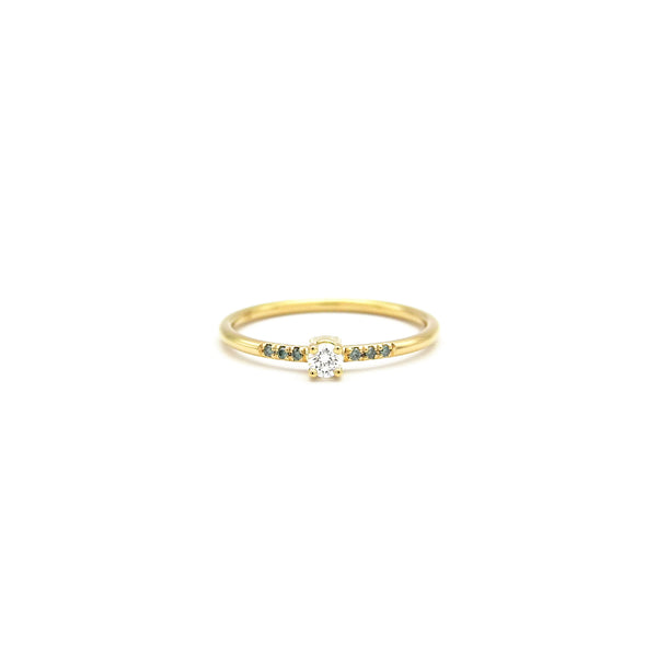 Schöner und besonderer Verlobungsring in minimalistischem Design, per Hand gefertigt aus 750-Gelbgold. Den zentriert gefassten Brillant schmücken auf jeder Seite je drei kleine blaugrüne Brillanten. Den Goldring fertigen wir passgenau in Ihrer Ringgröße an, bitte nehmen Sie mit uns Kontakt auf, falls Ihre Ringgröße nicht gelistet ist.
